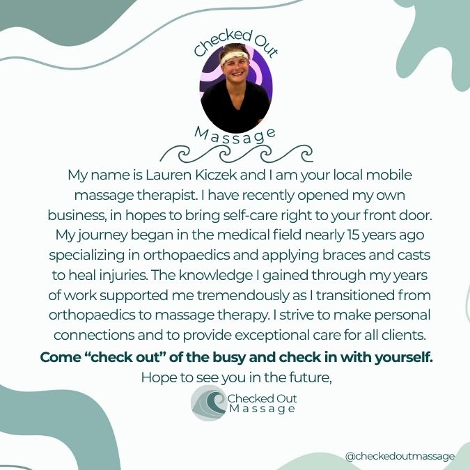 My name is Lauren Kiczek and I would like to thank you for considering me as your massage therapist. My journey began in the medical field for nearly 15 years specializing in orthopaedics and applying braces and casts to heal injuries. The knowledge I gained through my years of work supported me tremendously as I transitioned from orthopaedics to massage. I strive to make personal connections and to provide exceptional care for all clients - something that felt more and more difficult to do within the four walls of a doctor's office.
